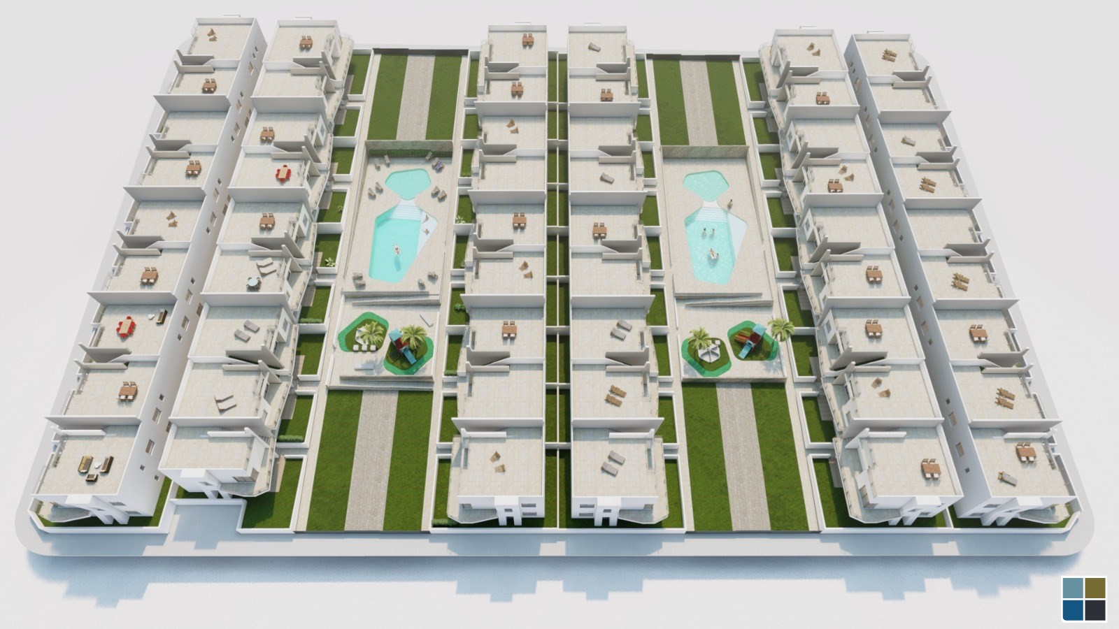 Residentiële bestaan uit bungalow appartementen met 1, 2 en 3 slaapkamers, op begane grond met een eigen tuin of bovenste verdieping met een eigen solarium.